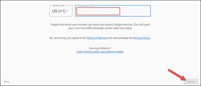 Şimdi, kullanmak ve tıklayın istediğiniz diğer Google Duo hesabıyla ilişkili telefon numarasını girebilirsiniz “Kabul.”