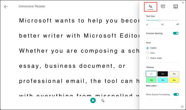 Bu, uygulama penceresini odaklı bir görünümde görüntüler. Daha sonra metin tercihleri için sürükleyici okuyucuyu özelleştirebilirsiniz, Dilbilgisi seçenekleri ve tercihleri okuma.