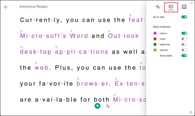 Dilbilgisi seçenekleri : Bu alan size heceler için basit geçişler ve konuşmanın parçaları verir. Bir veya daha fazla konuşma için bir geçiş yapabiliyorsanız, rengi seçebilirsiniz. Ayrıca, kelimenin üstündeki konuşmanın bir parçası için kısaltmayı yer alan etiketleri açma seçeneğiniz de vardır.