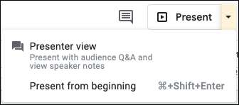 Bir Google Slaytları Sunumuna ekranın üstündeki "mevcut" veya okunu tıklatarak veya seçerek " Sunucu Görünümü "Veya" baştan geliyor. "
