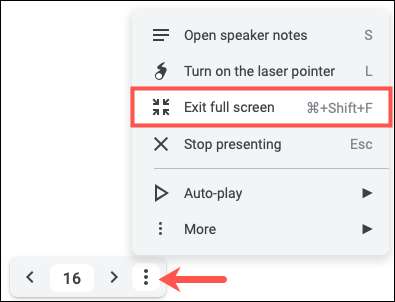 İmlecinizi slayt gösterisinin sol altına getirin ve bu araç çubuğu ekranını göreceksiniz. Sağa üç nokta kullanarak Seçenekler menüsünü açın ve "Tam Ekrandan Çık" seçeneğini seçin.