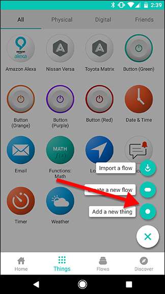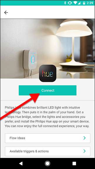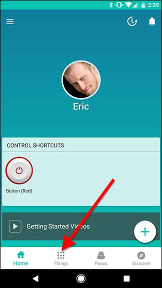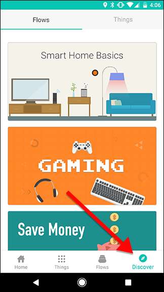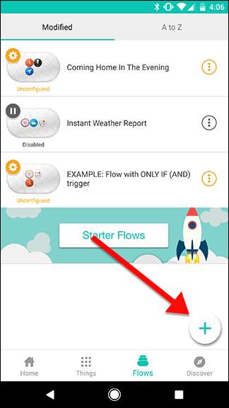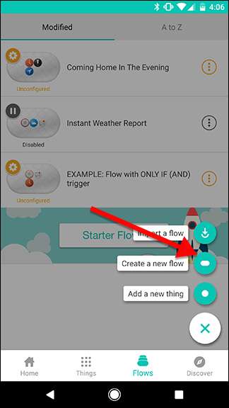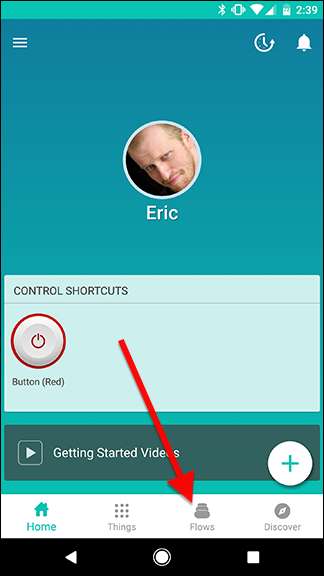 Elbette, muhtemelen kendi Akışlarınızı yaratmak istersiniz. Bunun nasıl yapılacağını göstermek için Nest termostatımızı Eko moduna ayarlayan ve evden çıktığımızda Philips Hue ışıklarımızı kapatan bir Akış oluşturacağız, bir tek sabah boyunca. Başlamak için uygulamayı açın ve alt çubuktaki Akışlar'a dokunun.
