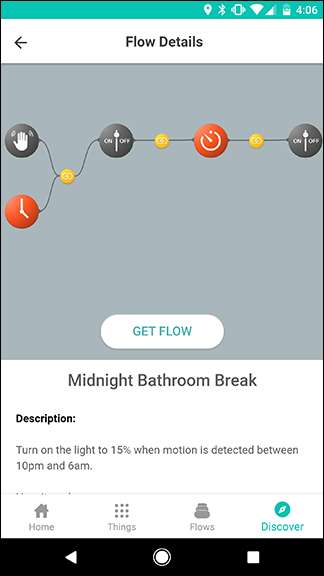 Tüm cihazlarınızı bağladıktan sonra kendi Akışlarınızı oluşturmaya başlayabilir veya sizin için zaten yapılmış olanlardan bazılarını etkinleştirebilirsiniz. Stringify’ın mevcut Flows uygulamasına göz atmak için uygulamayı açın ve sağ alttaki Keşfet seçeneğine dokunun. Beğendiğiniz bir Akış bulduğunuzda, hesabınız için etkinleştirmek üzere Akış Al'a dokunabilirsiniz.