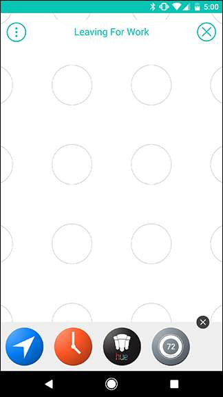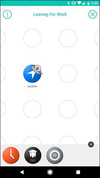 Bu noktadan itibaren, Eşyalarınız nereye yerleştirdiğiniz önemli olacak . Genellikle tetikleyiciler sola, eylemler sağa gider. Örneğin, evden çıktığınızda oturma odanızın ışığını kapatmak istediğinizi varsayalım. Konum tetiği sola, Hue eylemi sağ tarafa gider. Önce bunu ayarlayalım. Hue Thing'inizi doğrudan Konumun sağındaki ızgaraya sürükleyin, ardından dişli simgesine dokunun.