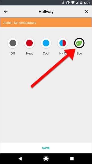 Seçenekler listesinden Eko modunu seçin. Bu, yapabileceğiniz önceden ayarlanmış Eko modu sıcaklıklarını kullanacaktır. Nest uygulamasında ayarlayın . Bitirmek için Kaydet'e dokunun.