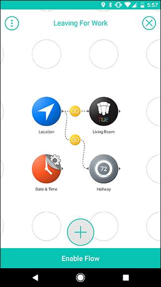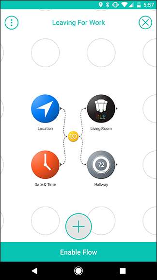 Yine de bundan daha güçlüdür. Örneğin, ona söylüyorsun bir tek çıkarken ışıklarını kapat sabahleyin . Stringify, IFTTT'nin aksine birkaç koşulu kabul edebilir ve aynı anda birden fazla şey yapabilir. Yani mesela, bu Akış işten ayrıldığınızda etkinleşir, ancak yalnızca 17: 00'dan sonra ayrılırsanız. Ardından, eve gitmenizin ne kadar süreceğini kontrol eder ve Nest termostatınızı, siz oraya vardığınızda evinizi hazır hale getirecek şekilde ayarlar. Bu hala oldukça basit, ancak iki koşul ve iki eylem gerektirdiğinden, IFTTT için çok karmaşık.