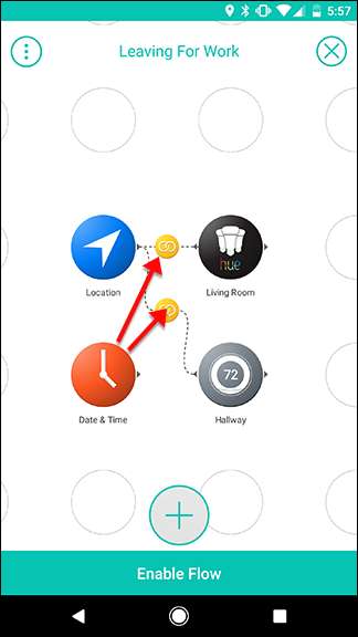 Çok sinir bozucu bir şekilde, Stringify, karışırsanız bağlantıları düzenlemenize izin vermez, bu nedenle Akışlarınızı oluşturmadan önce mantığınızı planladığınızdan emin olun. Örneğin, bu Akışta, evden çıktığınızda ışıklar her zaman kapanacak, ancak Nest termostatı yalnızca sabah ayrılırsanız kapanacak şekilde ayarlayabilirsiniz. Bunu yapmak için, Tarih ve Saat Öğesinden Konum ve Ton arasındaki sarı bağlantıya sürüklemelisiniz. Ancak, Tarih ve Saat koşulunu atlar ve Yuva eylemine uygularsanız, Tarih ve Saat koşulunu kaldırmak için Yuva Öğesini kaldırmanız ve yeniden eklemeniz gerekir. Hakkında daha fazla bilgi edinebilirsiniz Stringify'ın Akışları nasıl çalışır ve burada nasıl yapılandırılır .