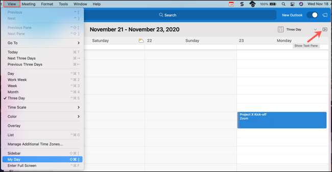 Günü Posta sekmesinde görmek için, sağdaki Görev bölmesini göster düğmesini tıklayın veya View & GT; Menü çubuğundan görev bölmesi. Bunu görmek için Diğer Outlook sekmelerinde, Görevi Göster düğmesini Göster düğmesini tıklayın veya Görüntüle & GT'yi seçin; Menü çubuğundan günüm.