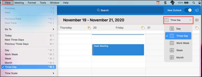 Outlook takviminizi açmak için "Takvim" sekmesini tıklayın. Oradan, sağ üstte açılır oku seçin veya View & GT; Menü çubuğunda üç gün.