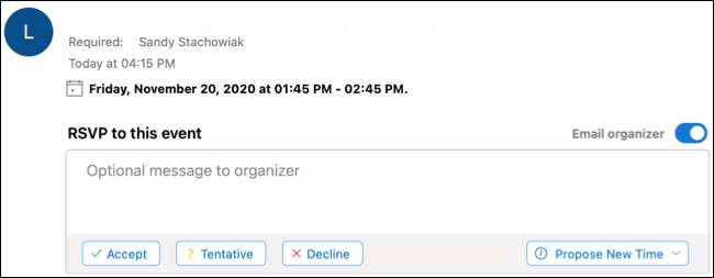 Her zaman olduğu gibi, "Kabul et" "TENTATICT," "DECINE," veya "Yeni Zamanlar Prove" yi tıklayabilirsiniz. Bu seçeneklerin hemen üstünde, olay organizatörüne göndermek için isteğe bağlı bir mesaj yazabileceğiniz kutuyu göreceksiniz. Sadece bir mesaj eklemek istiyorsanız, bir yanıt tıklamadan önce yaptığınızdan emin olun.
