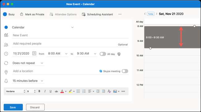 Yeni bir olay oluşturmak için, Dosya ve GT; Yeni ve GT; Herhangi bir Outlook sekmesinin menü çubuğundaki etkinlik. Veya "Takvim" sekmesini tıklayabilir ve ardından Sol üstteki "Yeni Etkinlik" i tıklayabilirsiniz. Daha sonra soldaki tüm etkinlik bilgilerinizi ekleyebilirsiniz.