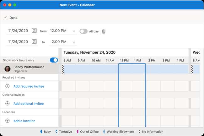 Muhtemelen, olayları planladığınız zaman "Meşgul" veya "ücretsiz" durumunu seçmeye alışkınsınız. Yeni Microsoft Outlook'ta, şimdi, şimdi başka bir seçeneğiniz var: "Başka bir yerde çalışmak."