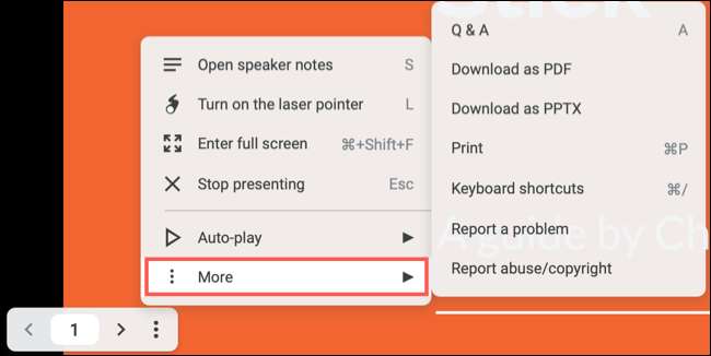 Taşma menüsünün alt kısmında "daha fazla" seçeneğidir. Bunu seçtiğinizde, bir Q & Amp; A izleyicilerinizle birlikte, Slayt gösterisini bir PDF olarak indirerek PowerPoint dosyası veya sunumu yazdırmak.