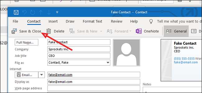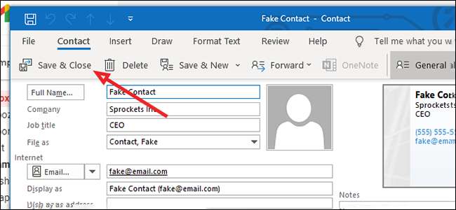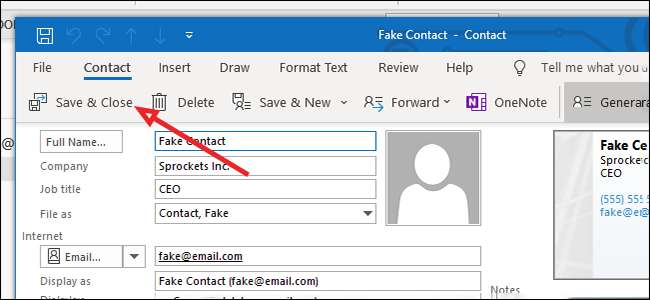 Outlook daha sonra "Rehber" menüsünü açacaktır. Kaydetmek için, sadece "Kaydet ve Amp; Kapat."