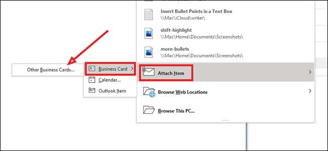 "Ekler" menüsünden, Öğe ve GT Ekle'yi seçin; Kartvizit ve GT; Diğer kartvizitler.