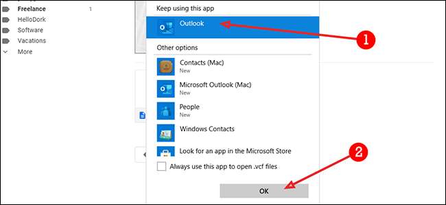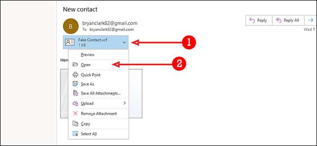 VCARD dosyasını Outlook'a içe aktarmak için, vCard'ın sağ tarafındaki oku tıklatın ve "Aç" ı seçin.