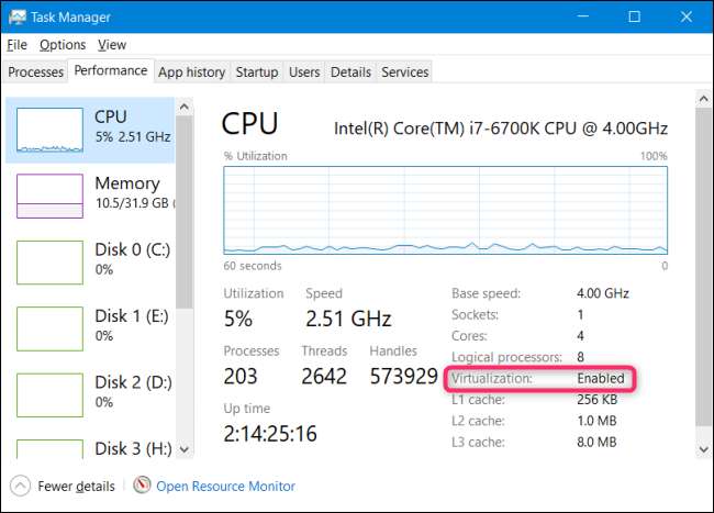 Öncelikle, sisteminizin BIOS'unda sanallaştırmanın etkinleştirildiğinden emin olmanız gerekir. Genellikle varsayılan olarak budur ancak kontrol etmenin kolay bir yolu vardır. Ctrl + Shift + Esc tuşlarına basarak Görev Yöneticisini çalıştırın ve ardından "Performans" sekmesine gidin. Solda ve sağda "CPU" kategorisinin seçildiğinden emin olun, sadece "Sanallaştırma: Etkin" yazdığından emin olun.