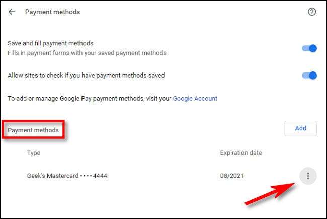 Ödeme Yöntemleri Ayarları altında, pencerenin altına yakın "ödeme yöntemleri" olarak da adlandırılan bir alt bölüm arayın. Chrome daha önce herhangi bir kredi kartı kaydetmişse, burada listelenecekler. Herhangi bir kart hakkında daha fazla bilgi görmek için, yanındaki "Üç Nokta" düğmesini tıklayın.