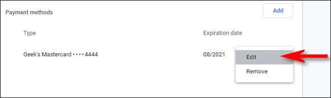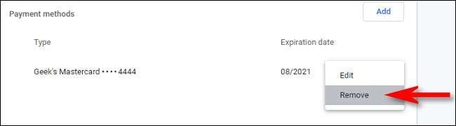 Ödeme yöntemleri ekranına geri dönün, Chrome Otomatik Doldurma'da kullanacağı yeni bir kredi kartı eklemek istiyorsanız, "Ekle" düğmesine tıklayın. Veya Google Chrome'da kaydedilen bir kredi kartını silmek istiyorsanız, listedeki kartın yanındaki üç noktaya tıklayın ve "Kaldır" ı seçin.