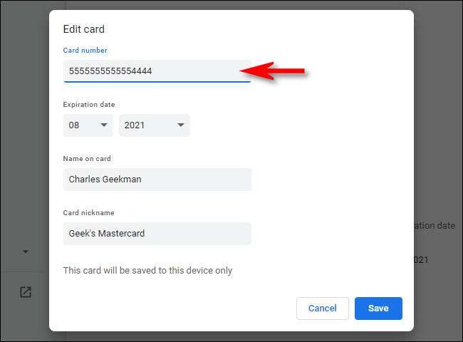 Açılan "Düzenle Kartı" penceresinde, kredi kartının tam sayısını, son kullanma tarihini, karttaki adını ve kartın takma adını görebilirsiniz.