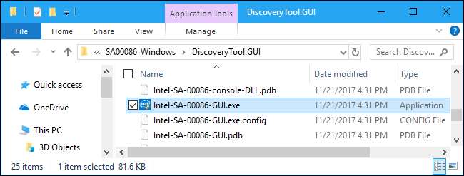 Aracı kullanmak için, Windows için ZIP dosyasını indirin, açın ve "DiscoveryTool.GUI" klasörüne çift tıklayın. Çalıştırmak için “Intel-SA-00086-GUI.exe” dosyasına çift tıklayın. UAC istemini kabul ettiğinizde PC'nizin savunmasız olup olmadığı size söylenecektir.