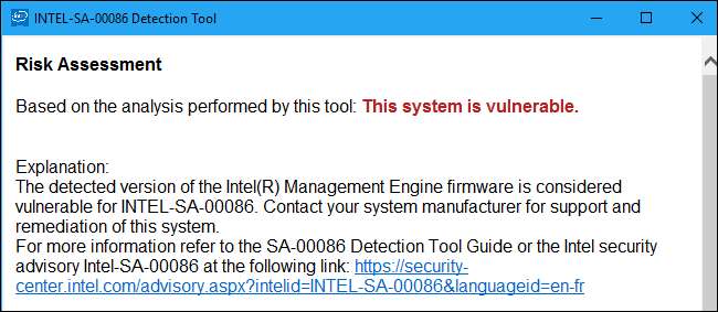 Intel bir algılama aracı Bilgisayarınızın Intel ME'sinin savunmasız olup olmadığını veya düzeltilip düzeltilmediğini öğrenmek için indirip çalıştırabilirsiniz.