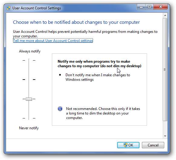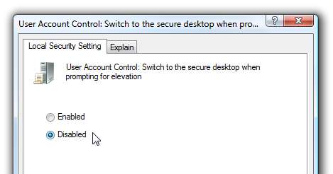 Windows 7 çalıştırıyorsanız, Denetim Masası'ndaki UAC ayarlarına gidebilirsiniz (veya UAC arama kutusuna) ve "Masaüstünü karartmayın" seçeneğini görene kadar kaydırıcıyı aşağı doğru sürükleyin.