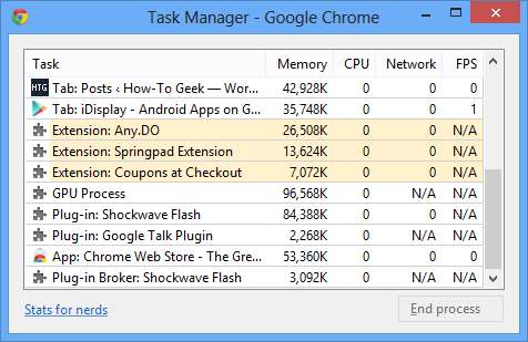 Burada listelenen öğelerin çoğu - aslında çoğunluğu - normal web sayfalarıdır, ancak bazıları yüklediğiniz uzantılarla ilgili olacaktır. Sadece şu anda bakmakta olduğunuz sekmenin, arka planda çalıştırmanız gereken her şeyle birlikte, büyük bir bellek yığınını kullanması gerektiği tartışılabilir.