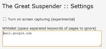Beyaz listeyi The Great Suspender'ın seçeneklerinde elle düzenlemek de mümkündür.