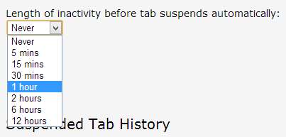 Açılır menüden bir süre (beş dakika ile 12 saat arasında) seçebilirsiniz ve bu hareketsizlik süresinden sonra sekmeler otomatik olarak askıya alınır. Sekmeden sonra sekmeyi açmaya devam eden biriyseniz, bu harika bir seçenektir.