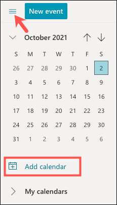 sol bölme gizli ise üst görüntülemek için soldaki üç dikey çizgiler (aynı zamanda, bir hamburger simgesi olarak da adlandırılır) tıklayın. ay görünümü takvimine altındaki “Takvim Ekle” yi tıklayın.