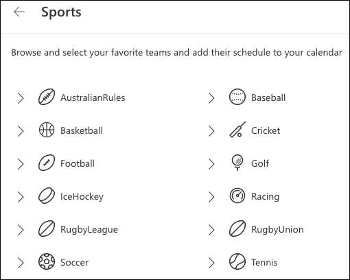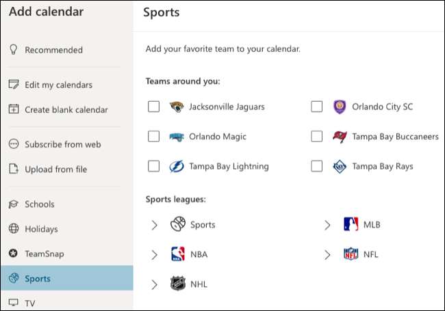 Takvim ekle penceresinde, sol tarafta bir seçenek belirleyin. Bunun için how-to, biz Sports seçeceğim. Bulunduğunuz yere bağlı olarak, Spor bölümünde çevrenizdeki ekipleri için öneriler görebilirsiniz. Ama aynı zamanda popüler bir lig seçebilir veya hepsini görebilirsiniz.