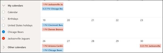 İşiniz bittiğinde, Takvim ekle penceresini kapatmak için sağ üstteki X işaretini tıklayın. Daha sonra takvimde sol bölmede ve etkinliklere My Takvimlerine eklenen spor veya TV programlarını görmelisiniz.