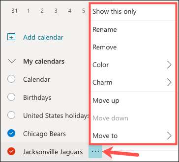 ekrana takvimleri işaretleyin veya gizlemek için işaretini kaldırın. , Takvimi yeniden adlandırabilir rengini değiştirmek, bir çekicilik ekleyebilir veya liste içinde taşımak için üç nokta tıklayın.