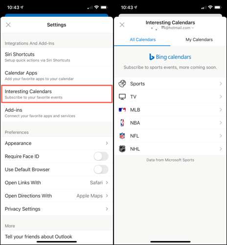 Outlook uygulamasını açın ve üst menüyü açmak için soldaki sekmesine dokunun. “Ayarlar” ı seçin ve ardından seçmek “İlginç Takvimlere.” Eğer, birden fazla varsa farklı bir hesap seçmek için üst kısmında e-posta adresine dokunun.
