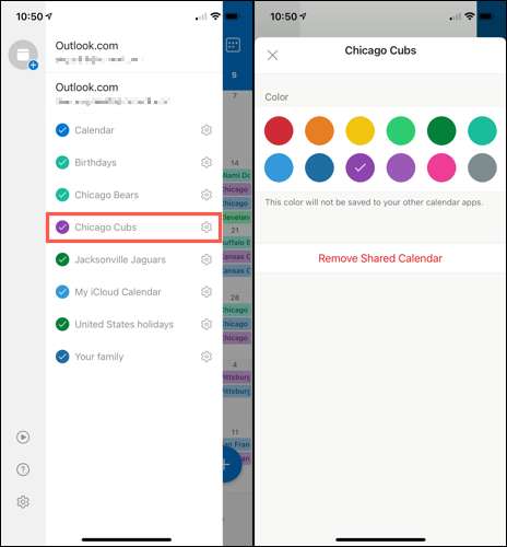 menüsünü açın ve bunu gizlemek veya rengini değiştirmek isterseniz takvim seçin. İşaretini kaldırın görüntülemek için kontrol çizelgesi gizleyebilir ve rengini ayarlamak için dişli simgesine dokunun.