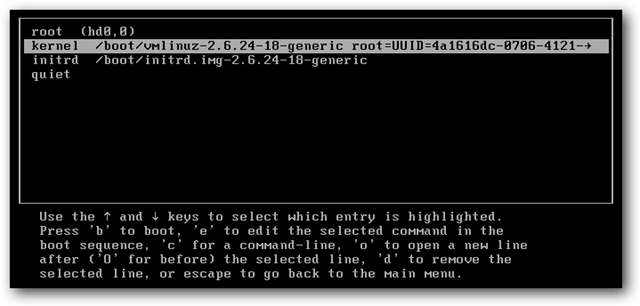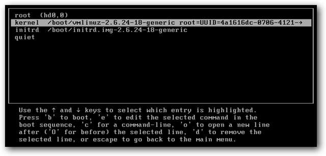 Öncelikle kullandığınız normal önyükleme çekirdeğini (tipik olarak yalnızca varsayılan olanı) seçtiğinizden emin olun ve ardından bu önyükleme seçeneğini düzenlemek için "e" tuşunu kullanın.