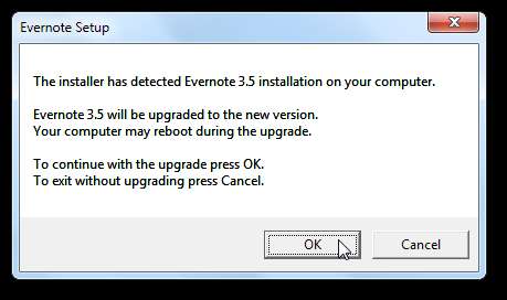 Henüz yapmadıysanız, aşağıdaki bağlantıya gidin ve Evernote 4'ü indirin. Zaten Evernote'un eski bir sürümü yüklüyse, eski sürümün kaldırılması ve bilgisayarınızın yeniden başlatılması istenir. Yüklemelerimizde yeniden başlatmamız gerekmedi, ancak kurulumunuza bağlı olarak bunu yapmanız gerekebilir. Tıklayın Tamam devam etmek.