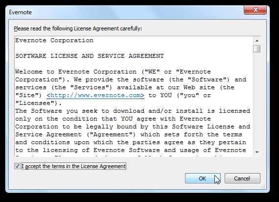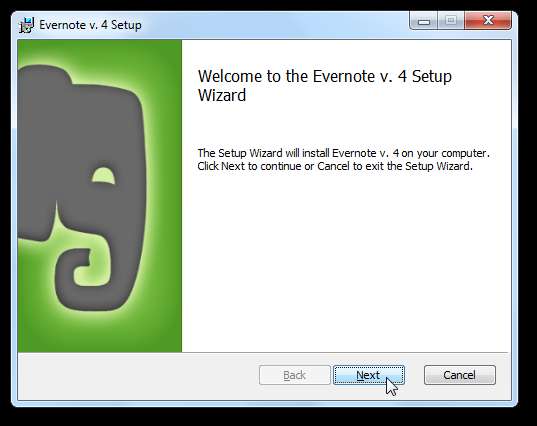 Şimdi kuruluma daha önce olduğu gibi devam edin. Evernote 4, eski sürümlerden çok daha hızlı yüklendi ve eski sürümlerden farklı olarak yalnızca bir UAC istemi gerektiriyordu.