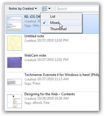 Veya bir küçük resimle birlikte notlar hakkında daha fazla bilgi veren liste moduna veya karma moda geçebilirsiniz.
