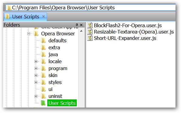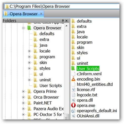 Bu eğitim için Windows Vista (32 bit) üzerinde çalışan Opera 10.00.1750 kullanıyoruz. Başlamak için en iyi yer, kullanıcı komut dosyalarınız için yeni ana sayfadır. Favori dosya yöneticisi uygulamanızı kullanarak, aşağıda gösterildiği gibi Program Dosyaları içindeki Opera Tarayıcı Klasörüne erişin.