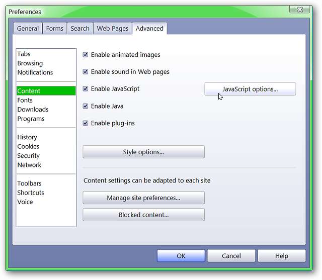 “Tercihler…” e tıkladığınızda bu pencere açılacaktır. "Gelişmiş Sekmeyi" açın ve sol taraftaki "İçerik" i seçin. "İçerik Bölümünü" görüntüledikten sonra, "JavaScript seçenekleri…" ni tıklayın.