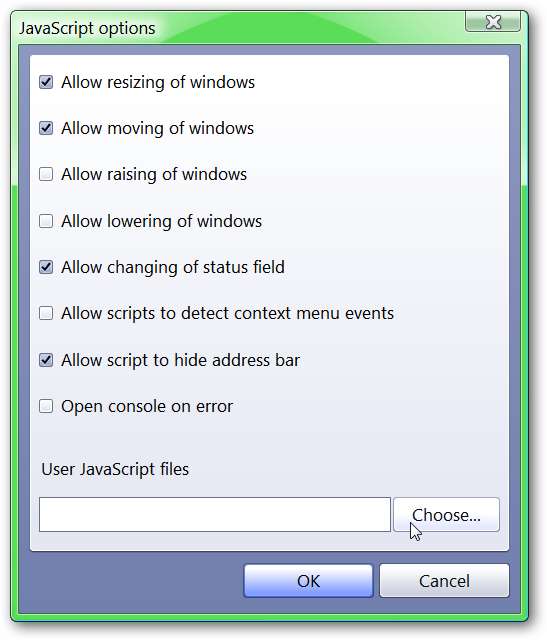 “JavaScript seçenekleri…” tıklandığında bu pencere açılır. Alt kısımda "Seç…" seçeneğine tıklamanız ve kullanıcı komut dosyalarınız için oluşturduğunuz yeni klasöre göz atmanız gerekecektir.