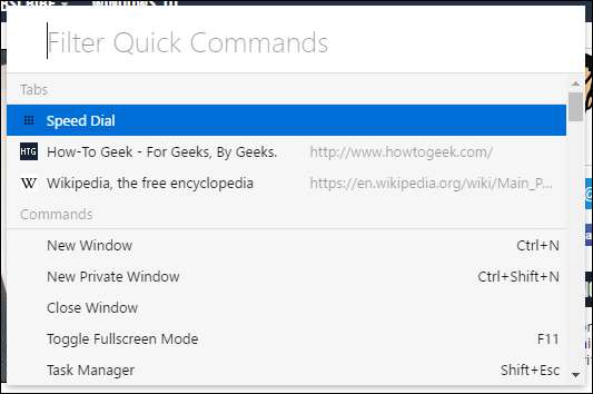Klavye kısayollarını seviyorsanız, Vivaldi’nin Hızlı Komutlar özelliğini beğeneceksiniz. Açık sekmelerde, yer imlerinde, tarama geçmişinde ve ayarlarda hemen hemen her şeyi yalnızca F2'ye basarak aramanıza olanak tanır. Hızlı Komutlar iletişim kutusu ayrıca size komutlar için klavye kısayollarını gösterir.