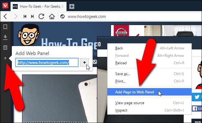 Tarayıcı penceresinin sol tarafındaki panel araç çubuğundaki artı işaretine tıklayarak veya bir web sayfasına sağ tıklayıp "Web Paneline Sayfa Ekle" yi seçerek web paneline bir web sitesi ekleyebilirsiniz.