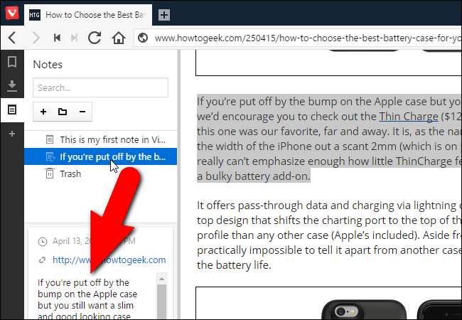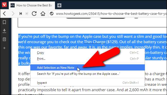 Yer işaretlerinizi, indirmelerinizi ve web sayfalarınızı yan panelde görüntülemenin yanı sıra, orada da not oluşturabilir ve saklayabilirsiniz. Notlar, web sayfalarının seçilmiş kısımlarını veya kendi yazdığınız düşüncelerinizi içerebilir. Notlar, web sayfalarının ve ekli dosyaların ekran görüntülerini bile içerebilir. İçeriği seçerek, üzerine sağ tıklayarak ve açılan menüden "Seçimi Yeni Not Olarak Ekle" yi seçerek bir web sayfasındaki içerikten bir not oluşturursunuz.