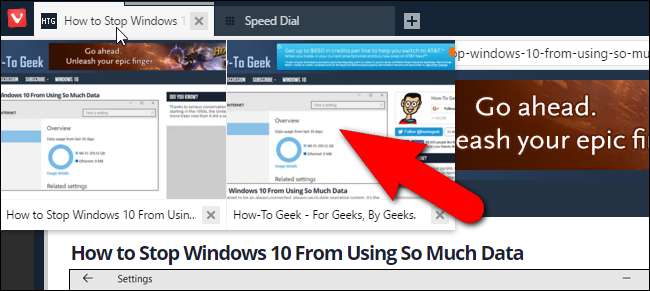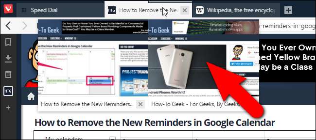 Vivaldi, o sekmeyi etkinleştirmek zorunda kalmadan bir sekmenin içeriğinin küçük bir sürümünü (küçük resim ön izleme) görüntülemenin bir yolunu sunar. Web sayfasının küçük resim önizlemesini o sekmede görmek için farenizi sekmenin üzerine getirin. Farenizi bir dizi yığılmış sekmenin üzerine getirirseniz, bu sekmelerdeki tüm web sayfalarının küçük resim önizlemelerini görürsünüz.