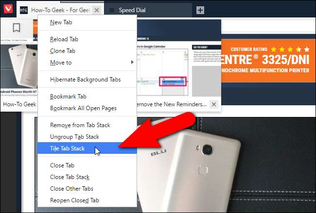 Bir tarayıcı oturumunda birçok sekme açma eğilimindeyim, bu da açtığım belirli web sayfalarını bulmamı zorlaştırıyor. Daha önce bahsettiğim Hızlı Komutlar özelliği, açık sekmelerde arama yapmanızı sağlar, böylece web sayfalarını bulmanıza yardımcı olabilir. Bununla birlikte, Vivaldi ayrıca sekme çubuğundaki ayrı sekmelerin miktarını azaltarak sekmeleri yığmanıza da olanak tanır. Diğer sekmedeki metin griye dönene kadar bir sekmeyi diğerinin üzerine sürükleyin.