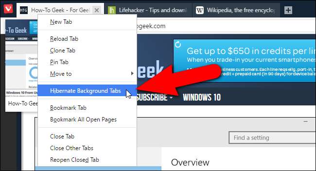 Tüm arka plan sekmelerinizi hazırda bekletme moduna geçirmek için, etkin sekmeyi sağ tıklayın ve açılan menüden "Arka Plan Sekmelerini Hazırda Beklet" seçeneğini seçin. Şu anda etkin olan sekmeniz etkin kalır.