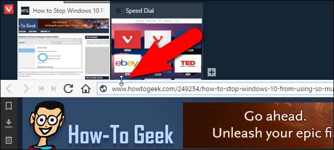 Sekmelerinizin tüm küçük resim önizlemelerinin statik bir görünümünü istiyorsanız, imleç iki yönlü bir oka dönüşene kadar farenizi adres çubuğunun üst kenarına getirin. Ardından, tüm sekmelerinizin ekranının küçük resim önizlemelerini görene kadar bu kenarlığı tıklayıp aşağı sürükleyin.